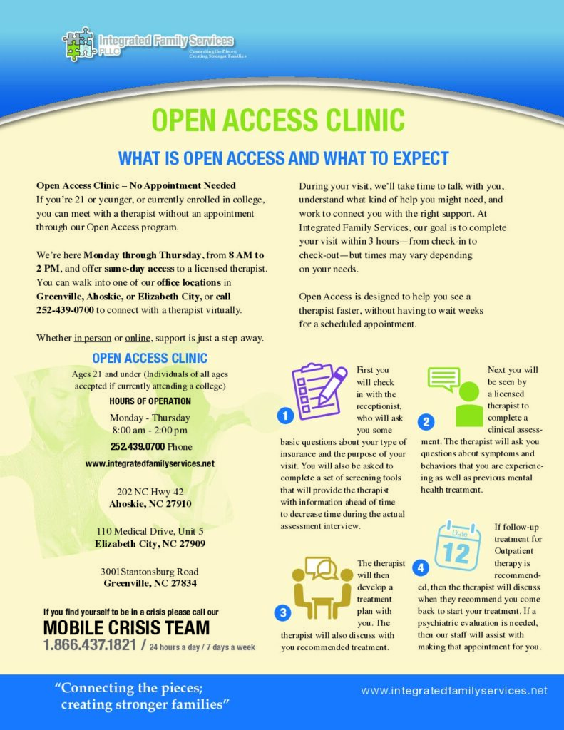 As an open access clinic, Integrated Family Services will be providing outpatient therapy services that will not require an appointment. When you are ready to engage in your treatment, you can just walk in or call 252-439-0700, Monday through Thursday, between 8 am and 2 pm for comprehensive clinical assessments.